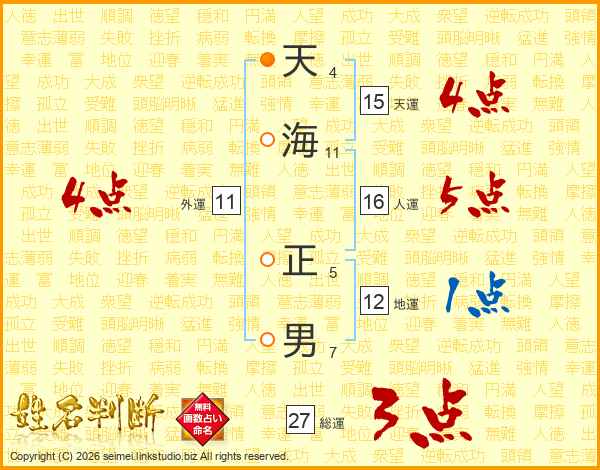 あなたの人生を表す1番重要な運勢です。生涯を通じて影響する総合運となり、主に50歳以降の晩年期に影響を及ぼします。苗字と名前の合計画数。