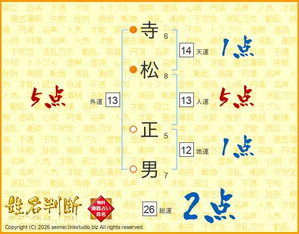 あなたの人生を表す1番重要な運勢です。生涯を通じて影響する総合運となり、主に50歳以降の晩年期に影響を及ぼします。苗字と名前の合計画数。
