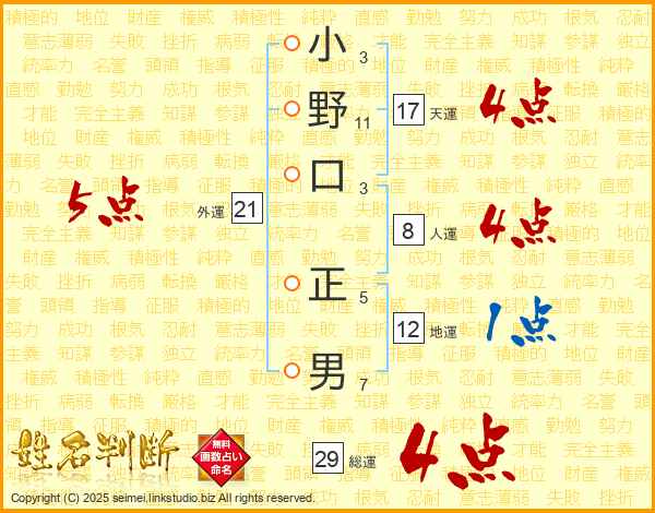 小(3画)野(11画)口(3画) 正(5画)男(7画)