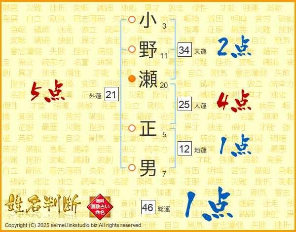 小(3画)野(11画)瀬(20画) 正(5画)男(7画)