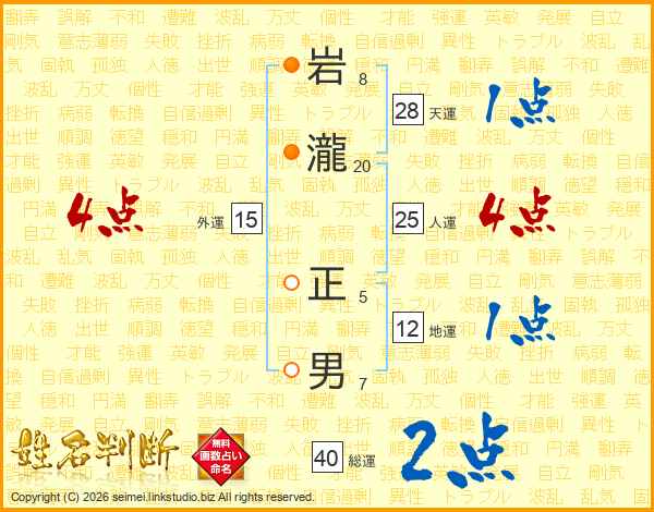 岩(8画)瀧(20画) 正(5画)男(7画)