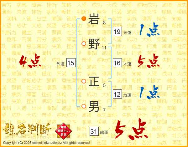 生活面を象徴する運勢です。外部から受ける影響力を表し、結婚運、家庭運や職場、環境への順応性を表します。総運から人運を引いた画数。姓や名が1文字の場合を除く。