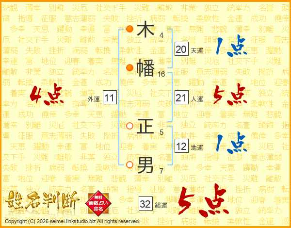 あなたの人生を表す1番重要な運勢です。生涯を通じて影響する総合運となり、主に50歳以降の晩年期に影響を及ぼします。苗字と名前の合計画数。