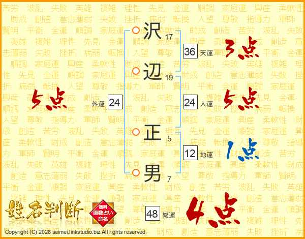 あなたの人生を表す1番重要な運勢です。生涯を通じて影響する総合運となり、主に50歳以降の晩年期に影響を及ぼします。苗字と名前の合計画数。