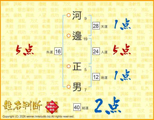生活面を象徴する運勢です。外部から受ける影響力を表し、結婚運、家庭運や職場、環境への順応性を表します。総運から人運を引いた画数。姓や名が1文字の場合を除く。