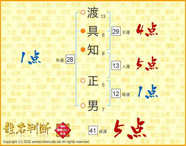 渡(13画)具(8画)知(8画) 正(5画)男(7画)