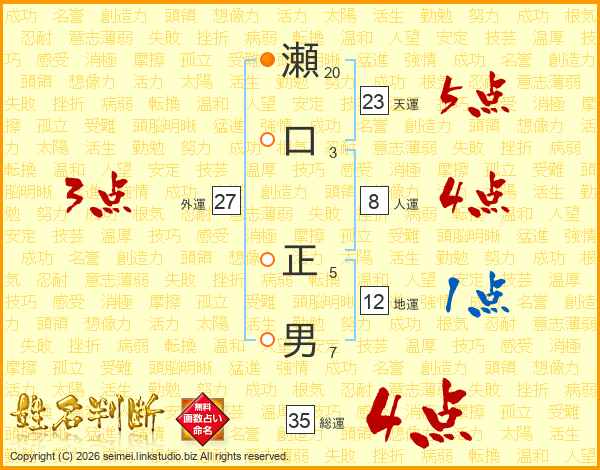 瀬(20画)口(3画) 正(5画)男(7画)