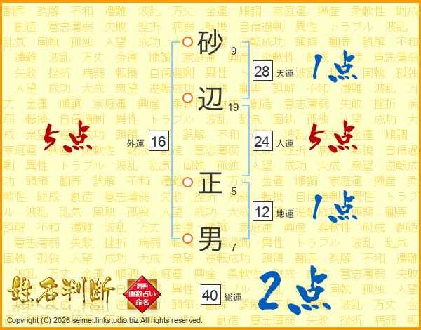 生活面を象徴する運勢です。外部から受ける影響力を表し、結婚運、家庭運や職場、環境への順応性を表します。総運から人運を引いた画数。姓や名が1文字の場合を除く。