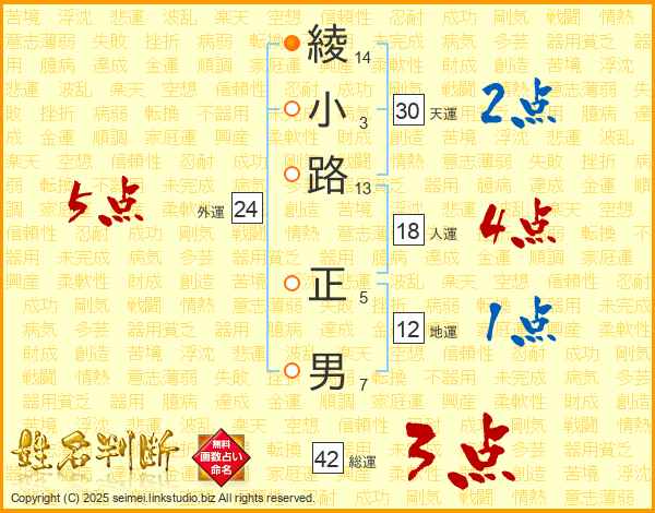 綾(14画)小(3画)路(13画) 正(5画)男(7画)