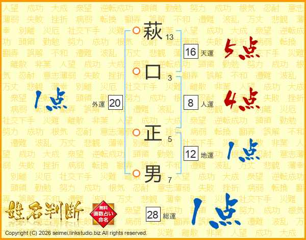 あなたの人生を表す1番重要な運勢です。生涯を通じて影響する総合運となり、主に50歳以降の晩年期に影響を及ぼします。苗字と名前の合計画数。