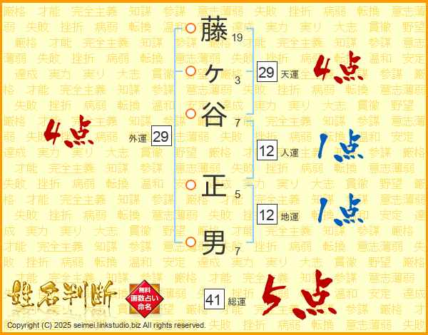 藤(19画)ヶ(3画)谷(7画) 正(5画)男(7画)