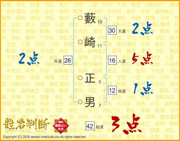 藪(19画)崎(11画) 正(5画)男(7画)
