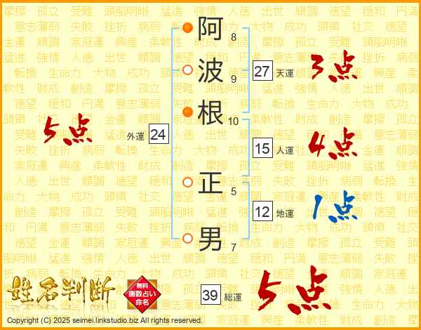 阿(8画)波(9画)根(10画) 正(5画)男(7画)