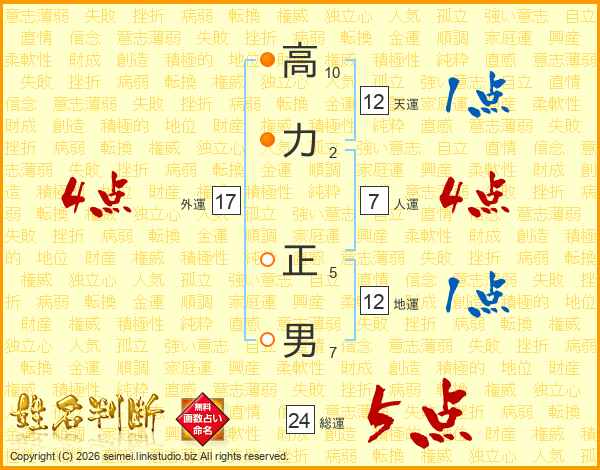 生活面を象徴する運勢です。外部から受ける影響力を表し、結婚運、家庭運や職場、環境への順応性を表します。総運から人運を引いた画数。姓や名が1文字の場合を除く。