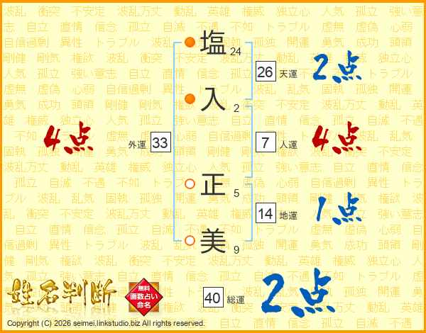 塩(24画)入(2画) 正(5画)美(9画)