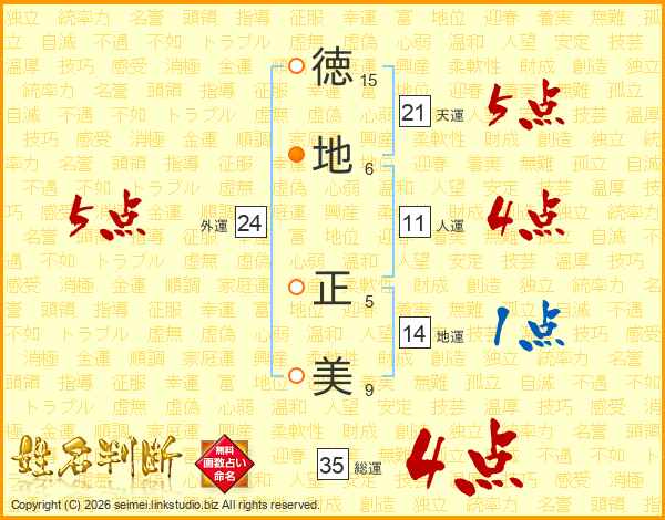 徳(15画)地(6画) 正(5画)美(9画)