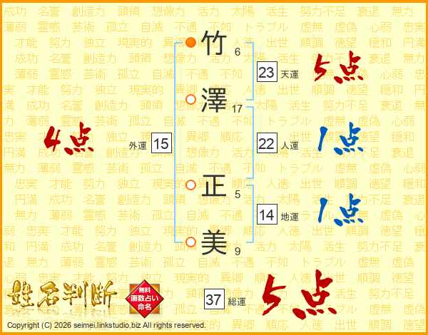 生活面を象徴する運勢です。外部から受ける影響力を表し、結婚運、家庭運や職場、環境への順応性を表します。総運から人運を引いた画数。姓や名が1文字の場合を除く。