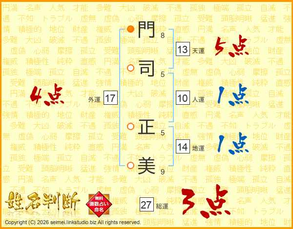 門(8画)司(5画) 正(5画)美(9画)