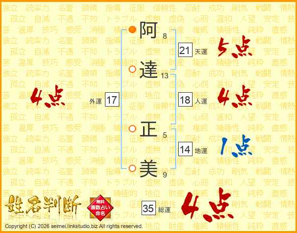阿(8画)達(13画) 正(5画)美(9画)