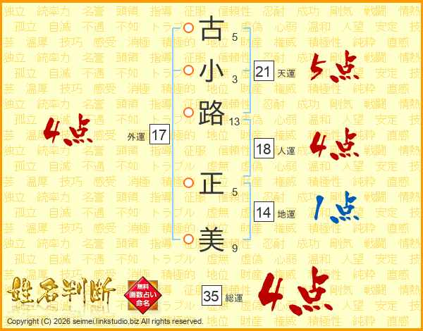 古(5画)小(3画)路(13画) 正(5画)美(9画)