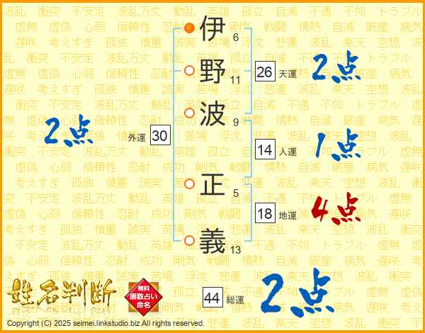 伊(6画)野(11画)波(9画) 正(5画)義(13画)