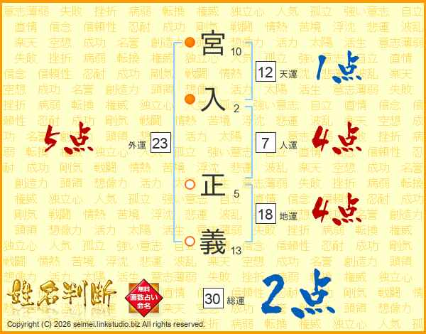 生活面を象徴する運勢です。外部から受ける影響力を表し、結婚運、家庭運や職場、環境への順応性を表します。総運から人運を引いた画数。姓や名が1文字の場合を除く。