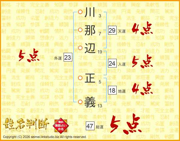 川(3画)那(7画)辺(19画) 正(5画)義(13画)