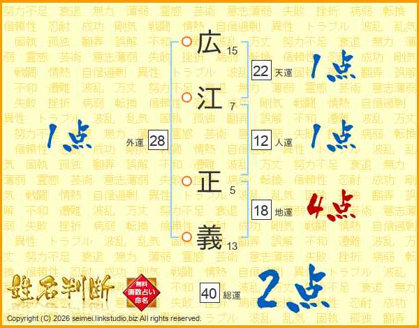 生活面を象徴する運勢です。外部から受ける影響力を表し、結婚運、家庭運や職場、環境への順応性を表します。総運から人運を引いた画数。姓や名が1文字の場合を除く。