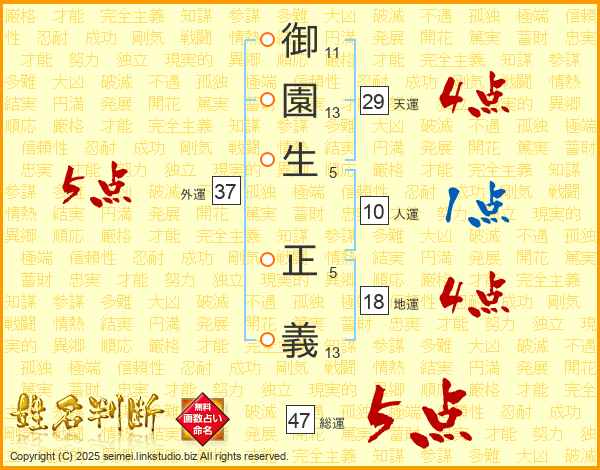 御(11画)園(13画)生(5画) 正(5画)義(13画)