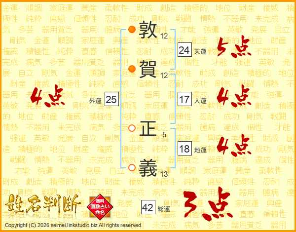 生活面を象徴する運勢です。外部から受ける影響力を表し、結婚運、家庭運や職場、環境への順応性を表します。総運から人運を引いた画数。姓や名が1文字の場合を除く。