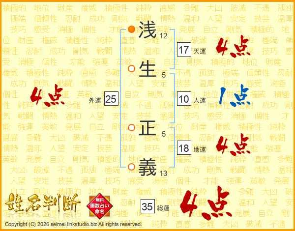 生活面を象徴する運勢です。外部から受ける影響力を表し、結婚運、家庭運や職場、環境への順応性を表します。総運から人運を引いた画数。姓や名が1文字の場合を除く。