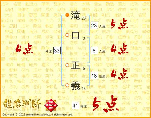 あなたの人生を表す1番重要な運勢です。生涯を通じて影響する総合運となり、主に50歳以降の晩年期に影響を及ぼします。苗字と名前の合計画数。