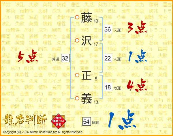 藤(19画)沢(17画) 正(5画)義(13画)