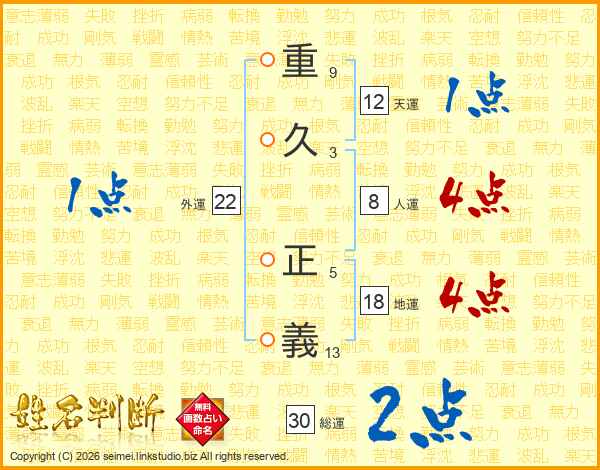 重(9画)久(3画) 正(5画)義(13画)