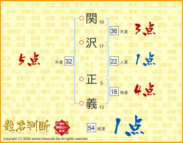 生活面を象徴する運勢です。外部から受ける影響力を表し、結婚運、家庭運や職場、環境への順応性を表します。総運から人運を引いた画数。姓や名が1文字の場合を除く。