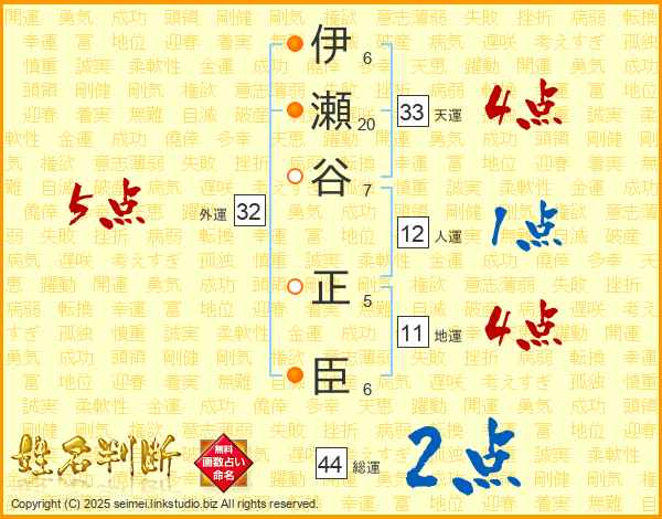 伊(6画)瀬(20画)谷(7画) 正(5画)臣(6画)