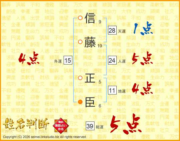 あなたの人生を表す1番重要な運勢です。生涯を通じて影響する総合運となり、主に50歳以降の晩年期に影響を及ぼします。苗字と名前の合計画数。