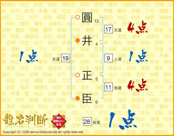 生活面を象徴する運勢です。外部から受ける影響力を表し、結婚運、家庭運や職場、環境への順応性を表します。総運から人運を引いた画数。姓や名が1文字の場合を除く。