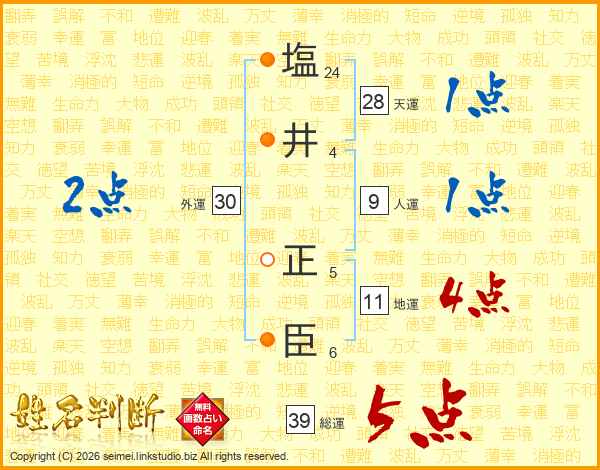 あなたの人生を表す1番重要な運勢です。生涯を通じて影響する総合運となり、主に50歳以降の晩年期に影響を及ぼします。苗字と名前の合計画数。