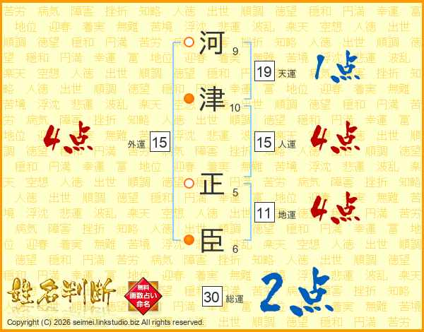 生活面を象徴する運勢です。外部から受ける影響力を表し、結婚運、家庭運や職場、環境への順応性を表します。総運から人運を引いた画数。姓や名が1文字の場合を除く。