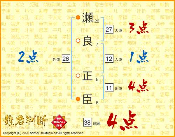 瀬(20画)良(7画) 正(5画)臣(6画)