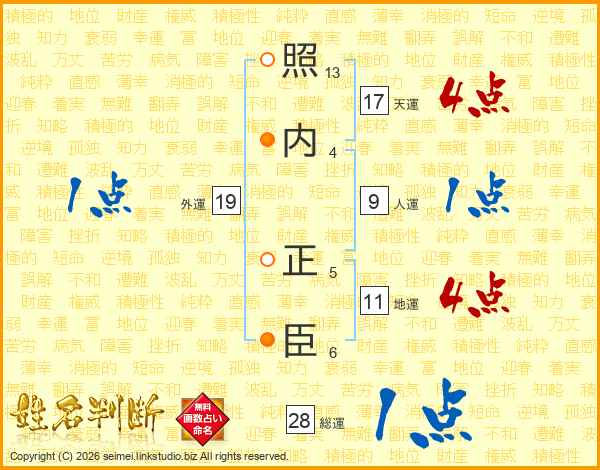 生活面を象徴する運勢です。外部から受ける影響力を表し、結婚運、家庭運や職場、環境への順応性を表します。総運から人運を引いた画数。姓や名が1文字の場合を除く。