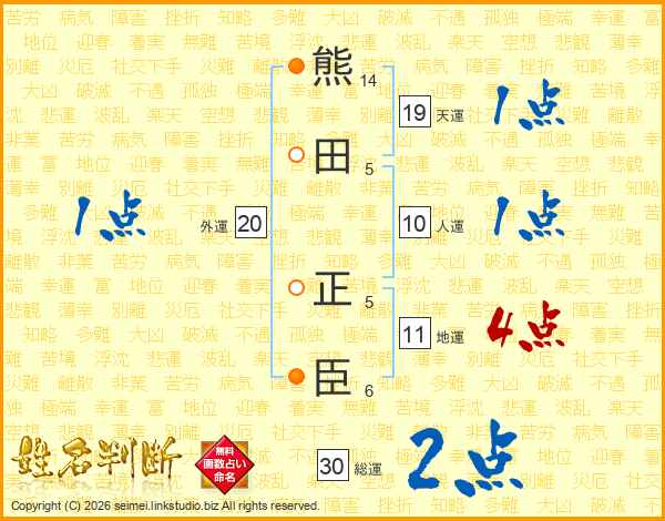 生活面を象徴する運勢です。外部から受ける影響力を表し、結婚運、家庭運や職場、環境への順応性を表します。総運から人運を引いた画数。姓や名が1文字の場合を除く。