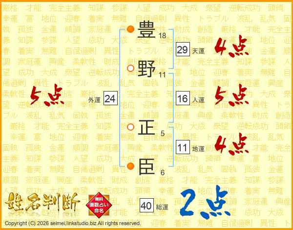 豊(18画)野(11画) 正(5画)臣(6画)