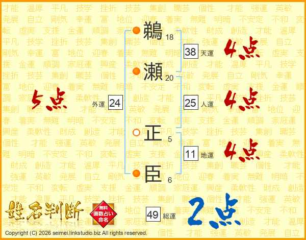 鵜(18画)瀬(20画) 正(5画)臣(6画)