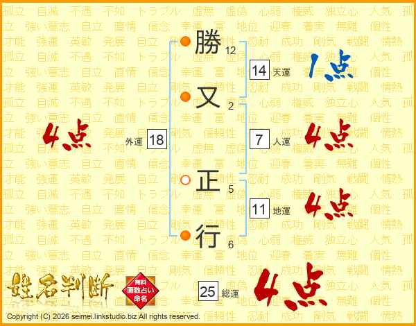 生活面を象徴する運勢です。外部から受ける影響力を表し、結婚運、家庭運や職場、環境への順応性を表します。総運から人運を引いた画数。姓や名が1文字の場合を除く。