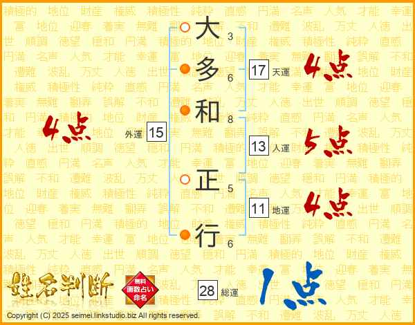 あなたの人生を表す1番重要な運勢です。生涯を通じて影響する総合運となり、主に50歳以降の晩年期に影響を及ぼします。苗字と名前の合計画数。