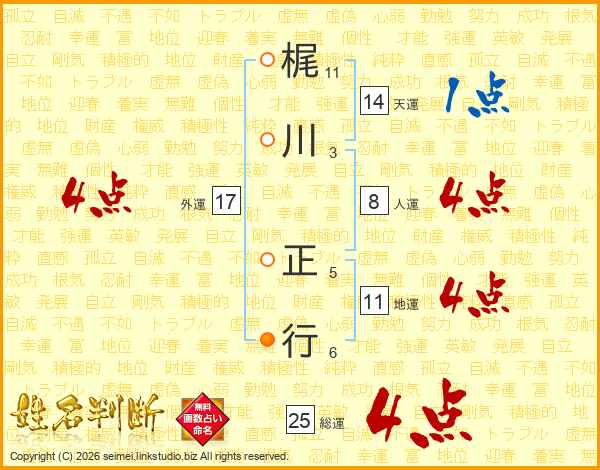 生活面を象徴する運勢です。外部から受ける影響力を表し、結婚運、家庭運や職場、環境への順応性を表します。総運から人運を引いた画数。姓や名が1文字の場合を除く。