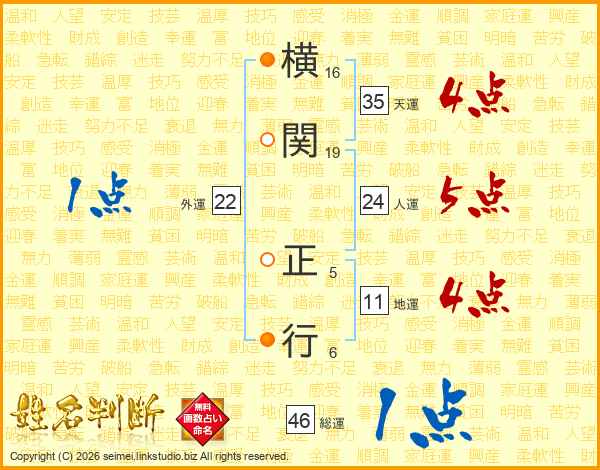 生活面を象徴する運勢です。外部から受ける影響力を表し、結婚運、家庭運や職場、環境への順応性を表します。総運から人運を引いた画数。姓や名が1文字の場合を除く。