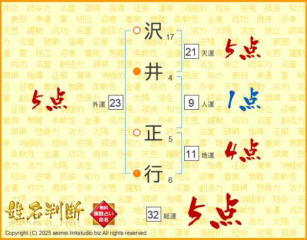 あなたの人生を表す1番重要な運勢です。生涯を通じて影響する総合運となり、主に50歳以降の晩年期に影響を及ぼします。苗字と名前の合計画数。